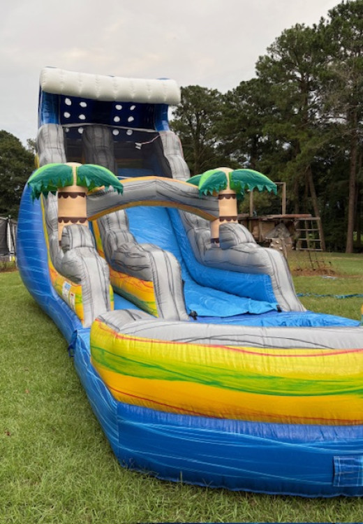 This single lane slide is sure to refresh and bring a tropical feel on a warm day. Enjoy this unit as you breeze past the palm trees. Base price is dry use. Select Pool feature to use wet.